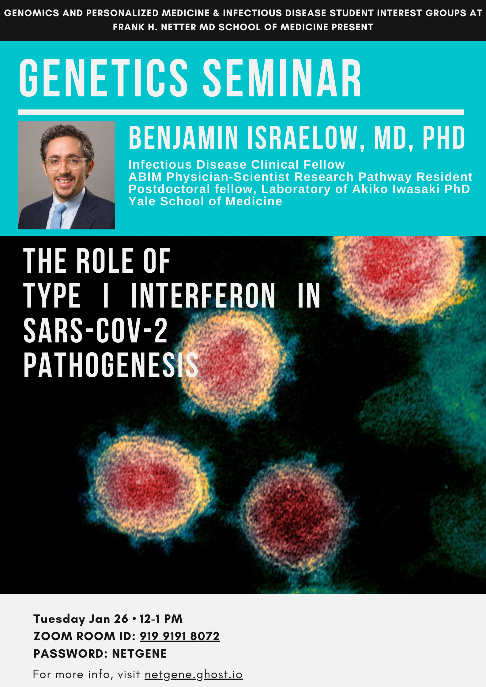 Join us for a Genetics Seminar series talk co-sponsored by the Infectious Disease Student Interest Group at Netter School of Medicine. We welcome Dr. Benjamin Israelow from the Iwasaki Lab at Yale School of Medicine.